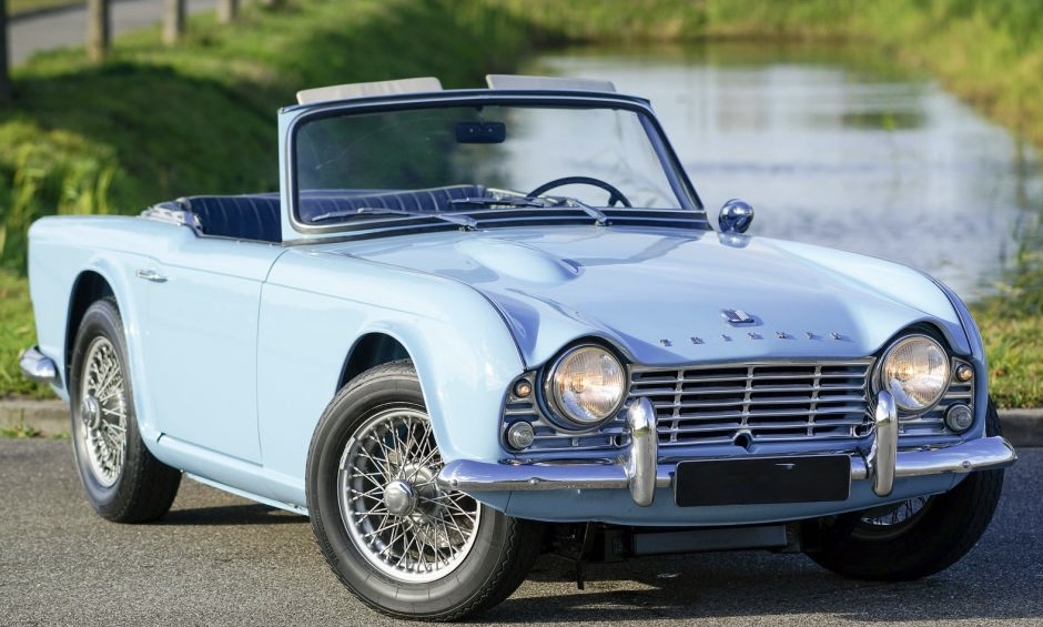 TR4 Triumph TR4, année 1962. Couleur « Powder Blue » combinée à un intérieur neuf en cuir bleu foncé (Shadow Blue) et à un tapis bleu foncé. Capote en vinyle